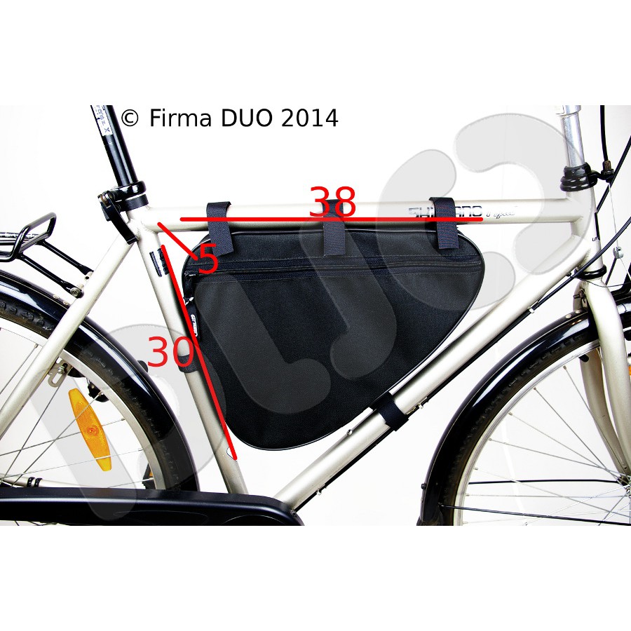 Duża torba pod ramę, w której przewieziesz narzędzia, klucze, dokumenty, itd. Może również uzupełniać torbę pod siodło. Mocowana 5 paskami rzepa. Posiada 3 osobne przedziały, po jednym z każdej strony torby.