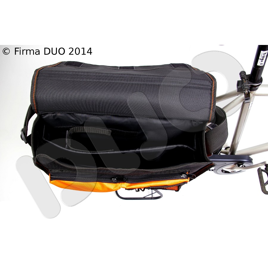 Torba na ramię z przedziałem na laptopa, wyposażona w dwa osłaniane, wysokiej jakości haki firmy Rixen & Kaul, które pozwalają na łatwe i bezpieczne zamocowanie na bagażniku roweru. Zaprojektowana dla rowerzystów, którzy chcą mieć swój laptop zawsze przy sobie. Przedział na laptop wyposażony jest w system regulacji, który zapobiega przesuwaniu sie laptopa wewnątrz torby. Osłona przeciwdeszczowa mieści się w jednej z dwóch przednich kieszeni pod klapą torby.